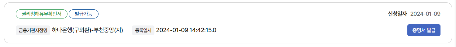 6> 권리침해유무확인서 신청을 하면 하단의 사진처럼 발급요청으로 확인이 됩니다. 권리침해확인서는 온라인으로 바로 출력이 되는 것이 아니라 온라인으로 신청을 하면 해당단지 담당자가 확인처리를 해주어야만 출력이 가능합니다.